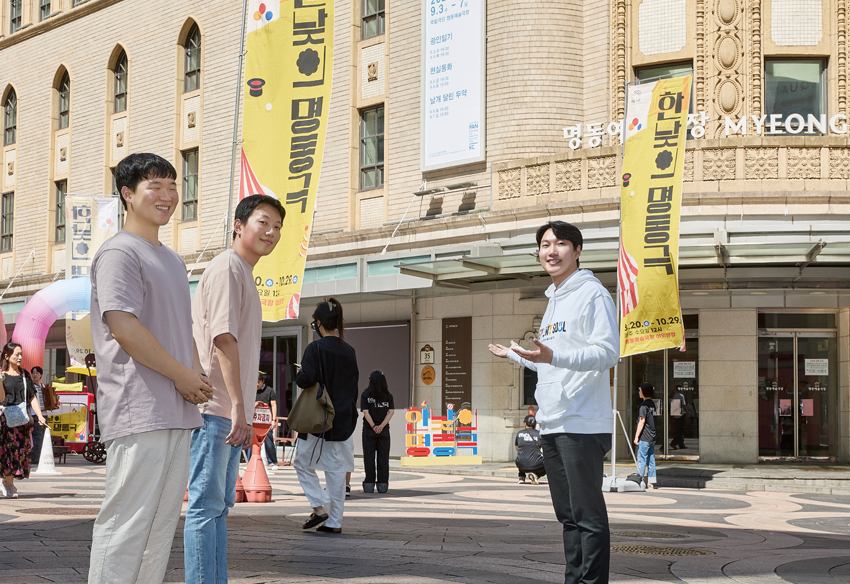가장 먼저 발걸음이 닿은 곳은 명동 거리. 사자보이즈가 등장해 ‘소다팝(Soda Pop)’ 을 불러 여성 팬들의 마음을 사로잡은 장소다. 이곳에 김규남 의원과 청년 직원 안세준, 이상규 씨가 함께했다.