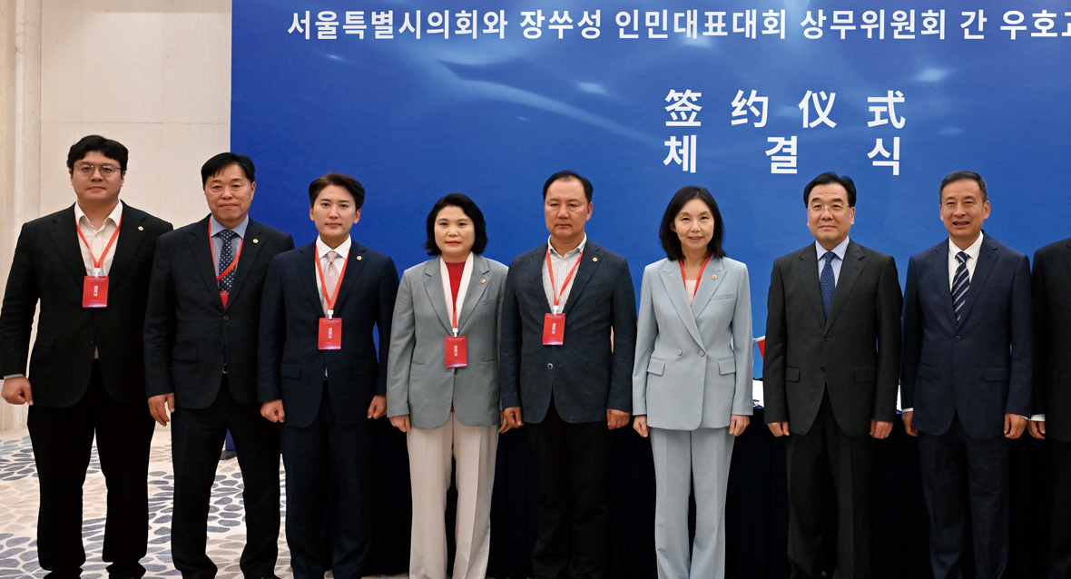 서울시의회는 10월 13일부터 17일까지 중국 장쑤성·상하이를 방문해 의회 간 우호 교류 협력 MOU를 체결했다. 이번 방문은 장쑤성 인민대표대회 상무위원회의 공식 초청으로 최호정 의장과 김동욱 의원(강남5·국민의힘), 박춘선 의원(강동3·국민의힘), 송도호 의원(관악1·더불어민주당), 이민석 의원(마포1·국민의힘), 이병윤 교통위원장(동대문1·국민의힘)이 함께했다. 최 의장은 한·중·일 3국 지방의회 원탁회의 기조연설에서 “한·중·일 지방의회 협력이 동아시아 사회에 혁신과 상생의 동력이 될 것”이라고 강조했다.