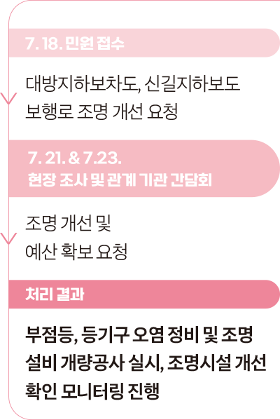 영등포구 지역 주민이 7월 18일 서울시의회 의회신문고를 통해 민원을 제기했다. 대방지하보차도와 신길지하보도 내 보행로 조명이 어두워 안전이 우려된다는 것. 이를 확인한 도문열 의원(영등포3·국민의힘)이 현장민원과에 검토를 요청했다.