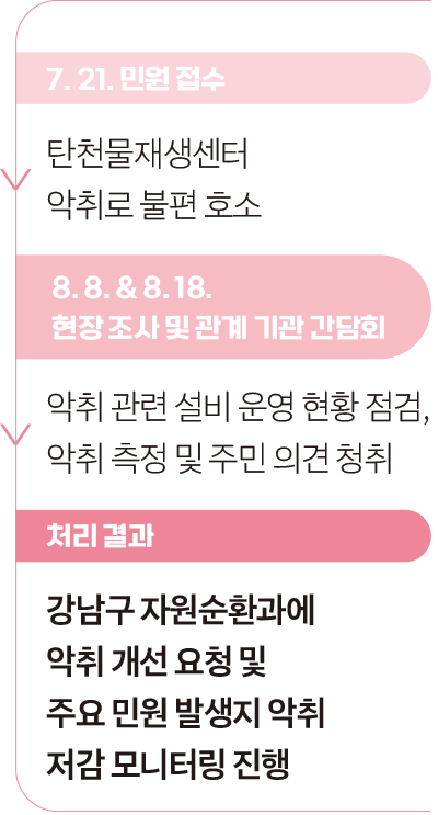 강남구 지역 주민이 7월 21일 민원을 보내왔다. 민원인은 대청아파트 관리사무소장으로, 탄천물재생센터에서 극심한 악취가 지속 발생해 입주민 민원이 급증하고 있다고 했다. 이를 확인한 유만희 의원(강남4·국민의힘)이 현장민원과에 악취 개선을 요청했다.