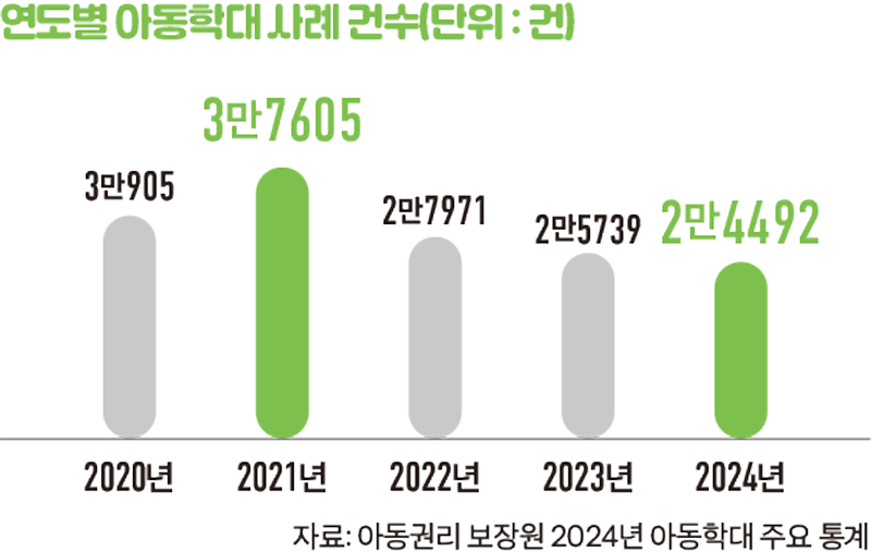 아동학대는 단순한 폭력이나 체벌만을 뜻하지 않는다. 멍, 화상, 골절처럼 눈에 보이는 상처뿐 아니라 언어적 위협이나 모욕, 감금 같은 정서적 학대, 성적 유희나 노출·착취 등 성적 학대, 그리고 의식주·치료·교육을 소홀히 하는 방임도 모두 포함된다. 특히 생후 36개월 이하 아이에게 가해지는 체벌은 어떤 이유로도 정당화될 수 없다. 아동학대 사례는 2022년부터 감소 추세를 보이고 있지만, 여전히 매년 2만 건을 훌쩍 넘기는 상황이다.