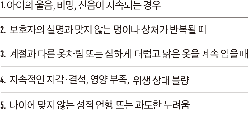 학대는 겉으로 드러나지 않게 반복되지만, 신호는 일상에서 나타난다. 계절과 다른 옷차림, 반복되는 멍, 보호자의 설명과 맞지 않는 상처, 이유 없는 지각과 결석, 지나친 위축이나 감정 변화, 또래와 다른 성적 행동 등은 모두 살펴야 할 징후다. 의심이 든다면 망설이지 않는 것이 중요하다. 누구든 국번 없이112 또는 관할 지자체에 신고할 수 있으며, 피해 아동의 이름이나 정확한 주소를 몰라도 접수가 가능하다. 양육 스트레스나 돌봄 공백, 가족 내 단절은 사소한 실수와 폭력의 경계를 흐리게 만든다.
