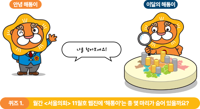 문제를 ‘해’결하고 시민과 소‘통’하는 해통이가 웹진 <서울의회> 11월호에 숨어 있어요. 기사 곳곳에 숨어 있는 해통이를 찾고 푸짐한 선물도 받으세요!