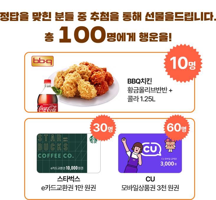 BBQ황올반 + 양념반 + 콜라 1.25L(10명), 스타벅스 1만 원권(30명), CU 3천 원권(60명)