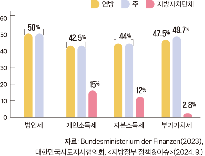 독일은 연방정부가 주정부와 지방정부에 세금을 ‘교부’하는 방식을 택하지 않는다. 대신 법으로 연방과 주, 지방자치단체 간 조세 수입 배분 구조를 명확히 규정해 동등한 조세 주권을 전제로 세원을 공유한다.