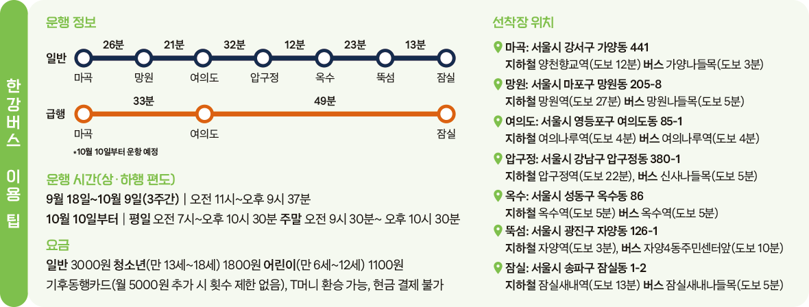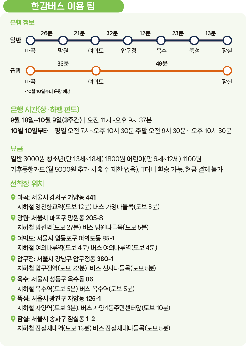 이탈리아의 베네치아 수로, 파리의 센강을 오가는 수상버스처럼 서울에도 수상 교통수단인 한강버스가 9월 18일부터 정식 운항을 시작했다. 단순히 풍경을 즐기는 유람선이 아니라 ‘버스’인 만큼 대중교통 기능을 손색없이 수행한다. 한강의 서쪽 관문인 마곡에서 출발해 총 7개 선착장을 상행과 하행으로 구분, 편도로 운행하며 마곡, 여의도, 잠실 3개의 선착장에만 서는 급행도 운영한다. 이동하기도 좋지만, 한강을 더 가깝게 즐기기 위한 수단으로도 좋다. 한강 다리를 지날 때마다 다리와 주변의 가볼 만한 곳들을 설명하는 안내 방송이 나와 풍경 감상을 돕는다. 노들섬, 남산서울타워, 세빛섬, 청담대교 등 평소 무심코 지나치던 서울의 일상이 새롭게 다가온다.