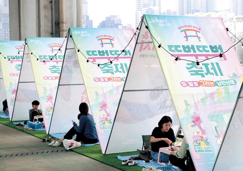 잠수교에서는 매주 일요일이면 ‘차 없는 잠수교 뚜벅뚜벅 축제’가 진행되는데, 올 상반기에만 103만 명이 찾을 정도로 인기가 높다. 9월 28일부터 10월 26일까지 하반기 축제가 총 4회 진행된다. 축제는 잠수교 북단부터 남단까지가 모두 행사 공간으로 규모가 매우 크다. 상반기 축제에서 가장 큰 사랑을 받은 프로그램은 피크닉 존과 힐링 존. 피크닉 존은 텐트로 구성된 공간에서 한강을 바라보며 휴식을 취할 수 있는 특별한 프로그램이다. 1시간 30분간 무료로 이용 가능하지만, 사전 예약 또는 현장 신청이 필요하다. 힐링 존에서는 빈백, 잔디, 돗자리 등 원하는 곳에 자리를 잡은 뒤 휴식을 취할 수 있다. 낭만적 분위기에서 특별한 여유를 만끽하고 싶다면 매주 일요일 잠수교로 향하자.