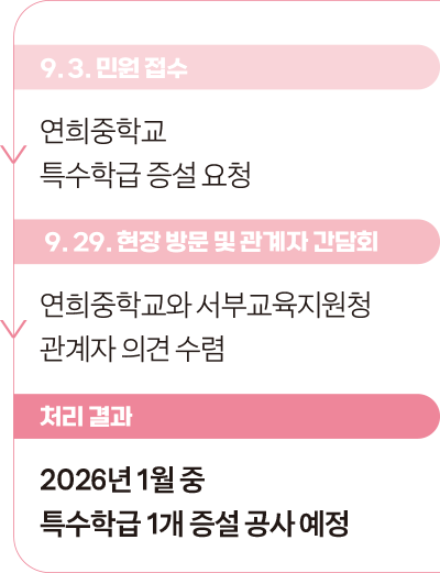 간담회 자리에서 교육청 관계자는 특수학급 설치와 관련된 법 기준을 준수해야 한다고 전했고, 학교 교직원은 추가 특수학급 설치에는 외부 시설 증축이 필요함을 피력했다. 양측 의견을 검토한 김 의원은 교육환경 개선을 위해 시의회 차원에서 예산 확보 및 제도적 지원 노력을 계속해 왔다. 이에 10월 초 연희중학교는 서부교육지원청에 특수학급 1개 증설을 신청했고, 10월 중순 서부교육지원청은 서울교육청에 2026년 예산 반영 요청을 완료했다. 특수학급 증설 공사는 2026년 1월 방학 중 진행된다. -