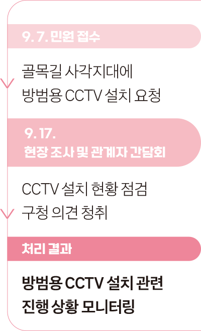 임종국 의원이 9월 7일 현장민원과를 찾았다. 성균관대학교 인근 골목에 방범용 CCTV 설치를 요청하기 위함이었다. 현장민원과는 9월 17일 현장에 방문했다. 먼저 CCTV 설치 현황을 살핀 결과, 주변에 많은 대학생이 거주하고 있으나 해당 골목길에 CCTV가 없어 안전 취약성이 높다는 것을 확인했다. 이어 관련 부서 간담회를 통해 종로구청의 의견을 청취했다. 구청은 한정된 방범용 CCTV 설치 예산 때문에 다각도의 평가가 필요하나, 향후 해당 지역을 CCTV 설치 대상지로 최대한 검토할 것을 약속했다. 현장민원과는 CCTV 설치를 위한 예산 반영 필요성을 인지했으며, 지속적 모니터링을 통해 진행 상황을 검토할 예정이다.