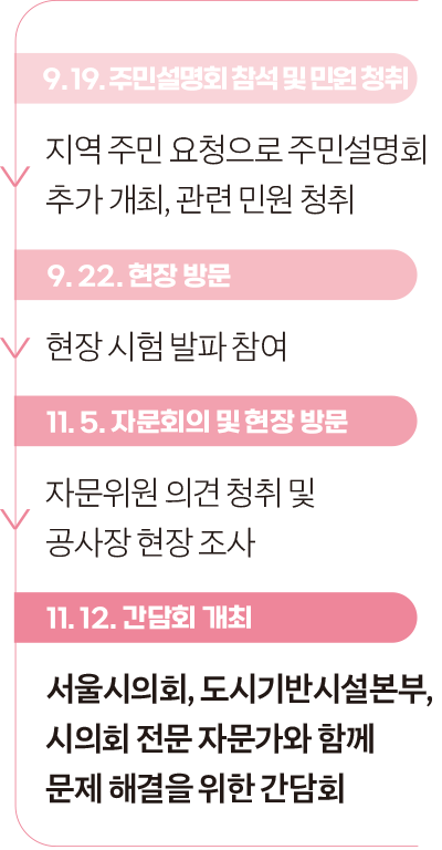 김혜지 의원은 9월 19일 지역 주민들의 요청으로 추가로 열린 주민설명회에 참석했다. 아이파크 입주민들이 고덕역 일대 9호선 4단계 연장 공사로 인한 불편 사항 해결을 요청한 것이다. 공사 소음, 진동 계측에 대한 불신, 집수정에서 나오는 라돈 등 안전문제로 공사 위치를 재검토해야 한다는 의견도 있었다. 김 의원은 9월 22일 현장 시험 발파에 참여했으며, 11월 5일 공사 현장 조사를 통해 불편 사항을 확인했다. 11월 12일 주민들과 함께 서울시의회 의장을 만나 도움을 요청하고 서울시 주무 부서 및 시의회 전문 자문가와 간담회를 가졌다. 김 의원은 이른 시일 내 9호선 4단계 수직구 안전에 대한 검토와 대책 마련을 실무 관계자들에게 요청했다.