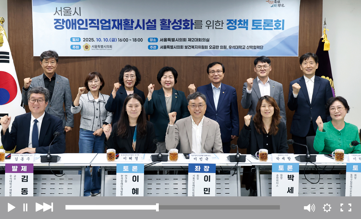 오금란 의원(노원2·더불어민주당)은 10월 10일 우석대학교 산학협력단과 공동으로 ‘서울시 장애인직업재활시설 활성화를 위한 정책 토론회’ 를 열고, 장애인직업재활시설에 대한 예산지원 효과를 객관적으로 검증하며 시설의 질적 향상을 위한 발전 방안을 논의했다. 김동주 우석대학교 재활상담학과 교수는 “서울시 장애인직업재활시설은 전국 최대 규모임에도 보건복지부 인건비·운영비 가이드라인을 지키지 못하고 있다” 고 지적했다. 이혜경 한국장애인개발원 정책연구부장은 “시설 장기 이용자 고착화 문제를 해소하고, 정책 수립 과정에 이용자와 보호자가 직접 참여할 수 있는 제도적 창구를 마련해야 한다”고 강조했다. 이덕재 동작구립장애인보호작업장 부모회 회장은 “서울시와 자치구가 재정을 분담해 시설 예산을 확대하고, 장애인에게 안정적인 일자리를 보장해야 한다”고 요청했다.