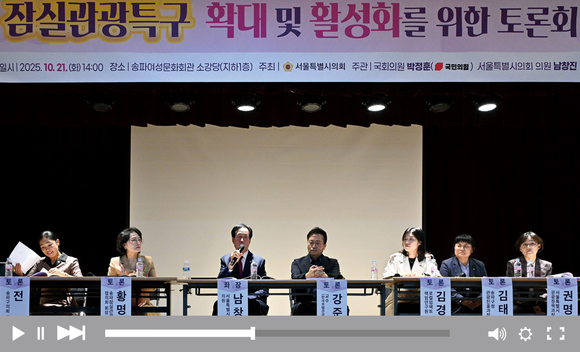 남창진 의원(송파2·국민의힘)은 10월 21일 송파여성문화회관 소강당에서 ‘잠실관광특구 확대 및 활성화를 위한 토론회’를 열었다. 강준수 안양대학교 교수는 잠실관광특구는 롯데월드타워와 석촌호수 중심의 단일형 관광에서 벗어나 역사·생활·자연·한류를 통합한 도시 체류형 관광 생태계로 전환해야 한다고 강조했다. 김경희 로컬임팩트 선임연구위원은 송리단길, 방이시장, 풍납토성 등 인접 지역을 포함해 관광특구를 확장하는 한편, 동선을 다변화하고 체류 시간을 연장하도록 유도해야 한다고 제안했다. 남 의원은 “특구 지정 13년 만에 확대와 활성화를 주제로 토론회를 열었다”며 “관광 전문가의 고견을 듣고, 주무관청·상인·주민들이 적극적으로 토론과 질의에 참여해 잠실관광특구 발전을 위한 의미 있는 소통의 장이 된 것을 뜻깊게 생각한다”고 밝혔다.