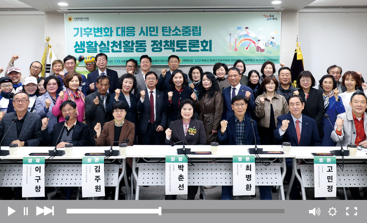 박춘선 의원(강동3·국민의힘)은 10월 21일 ‘기후변화 대응 시민 탄소중립 생활실천활동 정책토론회’를 열고 일상속에서 시민이 주도적으로 실천하는 탄소중립 활동을 공유하고, 이를 행정과 정책의 영역으로 확장할 방안을 논의했다. 박 의원은 “일상 속 실천이 곧 서울의 탄소중립을 완성하는 힘이 된다”고 강조했다. 이어 정권 건국대학교 교수가 도시의 열섬현상과 대기오염 문제를 해결하기 위한 대안으로 ‘이끼’를 제시하며 “강력한 생명력을 지닌 생물로, 도시의 새로운 탄소흡수원으로 주목받고 있다”고 설명했다. 김주원 한국여성소비자연합 사무처장은 ‘일회용 세탁 비닐 안 쓰기 운동’을 소개하며 시민과 업계가 함께 참여한 자발적 감축 사례를 제시했다. 박 의원은 마무리 발언에서 “정책이 시민의 실천을 품고, 시민의 행동이 다시 정책으로 이어지는 선순환 구조가 마련돼야 한다”고 말했다.