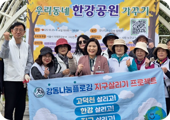 ‘우리동네 한강공원 가꾸기’ 활동박춘선 의원은 10월 25일 광나루한강공원에서 열린 ‘우리동네 한강공원 가꾸기’ 활동에 21녹색환경네트워크 강동지회 회원들과 함께 참여했다. 쓰레기를 줍고 생태교란종 식물을 제거하는 등 솔선수범을 보인 박 의원은 “주민과 함께 지속 가능한 환경문화를 확산해 나가겠다”고 밝혔다.