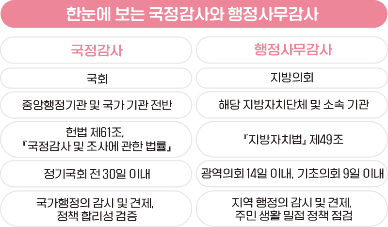 국감과 행감은 중앙과 지역이라는 행정 영역을 나누어 살피지만, 투명성 확보와 국민(시민)의 권익 보호라는 민주주의 핵심 가치 실현에 방향이 맞닿아 있습니다.
