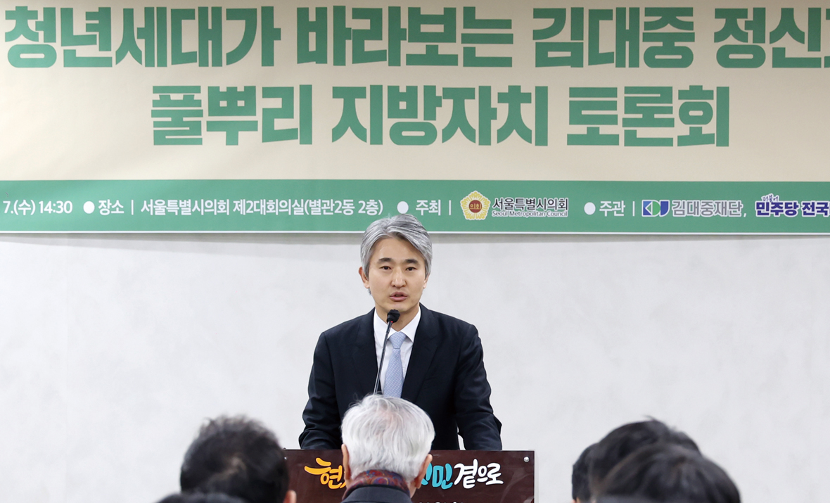 김인제 부의장(구로2·더불어민주당)은 1월 7일 김대중재단과 더불어민주당 전국대학생위원회가 공동주관한 ‘청년세대가 바라보는 김대중 정신과 풀뿌리 지방자치 토론회’에 참석했다. 이번 토론회는 민주주의와 인권, 평화, 국민 통합에 대해 청년들과 소통하고 새로운 지방자치의 비전을 모색하는 자리였다. 김 부의장은 “김대중 정신이 청년세대를 통해 다시 살아 숨 쉬며 일상에서 구현될 때 우리 민주주의는 한 단계 더 성숙할 것”이라며 “청년의 목소리가 제도와 정책으로 이어질 수 있도록 지방의회 차원에서 최선을 다하겠다”고 밝혔다.
