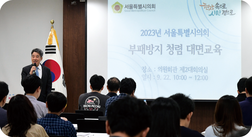 또 청렴을 의무화하는 시스템을 구축하고자 조례 제·개정을 추진하며 제도적 장치를 마련했다. 2025년 1월 「서울특별시의회 청렴문화 조성 및 지원에 관한 조례」, 3월 「서울특별시의회 공무원 행동강령 조례」 제정을 시작으로 반부패 제도 강화에 박차를 가해 왔다.