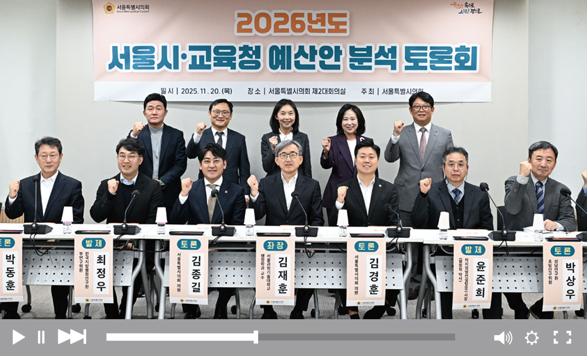 최호정 의장(서초4·국민의힘)은 11월 20일 열린 ‘2026년도 서울시·교육청 예산안 분석 토론회’에서 “민생과 시민 안전에는 과감히 투자하되, 필요와 효율이 떨어지는 지출은 걸러낼 필요가 있다”고 말했다. 앞서 제출된 2026년도 서울시 예산안은 전년도 대비 5.4% 증가한 총 51조4513억 원 규모로 편성됐다. 석과불식(碩果不食)의 관점에서 서울시 예산안 3대 투자 중점별(동행서울, 안전서울, 매력서울) 주요 사업과 8개 세부 사업비 분야(사회복지, 도로·교통, 공원·환경, 도시안전, 문화관광, 산업경제, 도시계획 및 주택정비, 일반행정)를 종합 분석했다. 서울시교육청 예산안은 전년도 대비 6.2% 증가한 11조4773억 원으로 편성됐다. 교육재정 구조와 정책 방향, 세입 전망, 디지털 전환 교육, 기초학력·늘봄학교·방과후 사업, 학교 신·증설 및 시설 개선 사업 등을 분석하며 기금을 사용한 예산편성과 인건비 규모의 적정성도 검토했다.