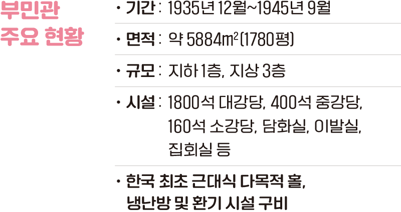 1930년대만 해도 대규모 문화 시설을 건립할 재원을 마련한다는 게 말처럼 쉽지 않았다. 그런데 1932년 경성전기회사가 기부금 100만 원(당시 쌀 80kg 가격 17.8원)을 경성부에 전달했고, 이 중 50만 원으로 부민관을 건립했다. 면적 1780평(약 5884㎡)의 부지에 세운 부민관은 지하 1층, 지상 3층 규모의 건물로 옥탑(시계탑)의 높이는 9층에 달했다. 1800석 대강당, 400석 중강당, 160석 소강당, 담화실, 집회실 등이 있었으며 식당과 이발실도 있었다. 당시로선 드물게 냉난방 및 환기 시설까지 갖춘 한국 최초의 근대식 다목적 홀로, 1935년 12월 완공 후 경성을 상징하는 대표적 건물로 소개됐다.