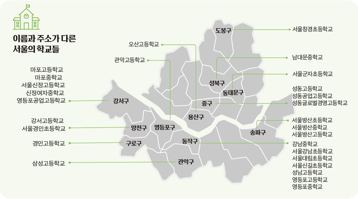 마포중·마포고본래 마포중과 마포고는 1950년 마포구에서 개교했다. 하지만 서울 도심 개발이 가속화되면서 학교 부지가 재개발 지역에 포함됐고, 이에 따라 같은 재단인 두 학교는 1985년 강서구 등촌동으로 이전하게 됐다. 중구에서 성북구로 옮긴 남대문중도 학교 이전으로 교명과 행정구역이 엇갈린 경우다.