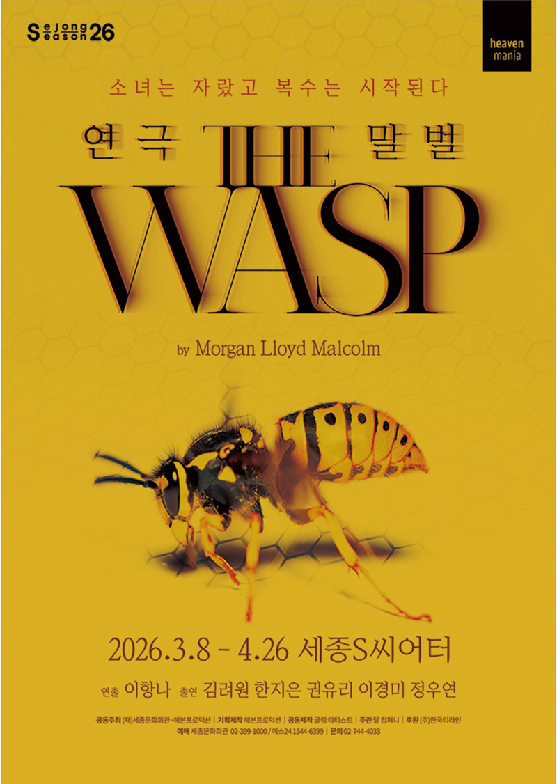 국내 초연 연극 <THE WASP>세종문화회관은 2026 세종시즌의 포문을 여는 첫 연극으로 영국 연극계의 화제작 <THE WASP(말벌)>를 국내 초연으로 선보인다. 이번 공연은 3월 8일 ‘세계 여성의 날’에 맞춰 개막해 작품이 품은 메시지를 더욱 선명하게 드러낸다. 영국 극작가 모건 로이드 말콤의 대표작인 이 작품은 2015년 런던 초연 당시 전석 매진을 기록하며 평단과 관객의 주목을 받았다. 이후 미국과 호주 등 세계 주요 무대에서 공연했고, 2016년 호주 ‘그린 룸 어워즈’ 주요 부문 노미네이트, 2024년 영화화 소식까지 이어지며 탄탄한 서사와 동시대성을 입증해 왔다. 작품은 고교 동창생인 ‘헤더’와 ‘카알라’가 20년 만에 재회하며 벌어지는 이야기를 다룬 2인극이다. <THE WASP>는 여성에게 씌워진 사회적 기대와 통념을 정면으로 비틀며 관계와 권력, 기억의 왜곡을 날카롭게 드러낸다.