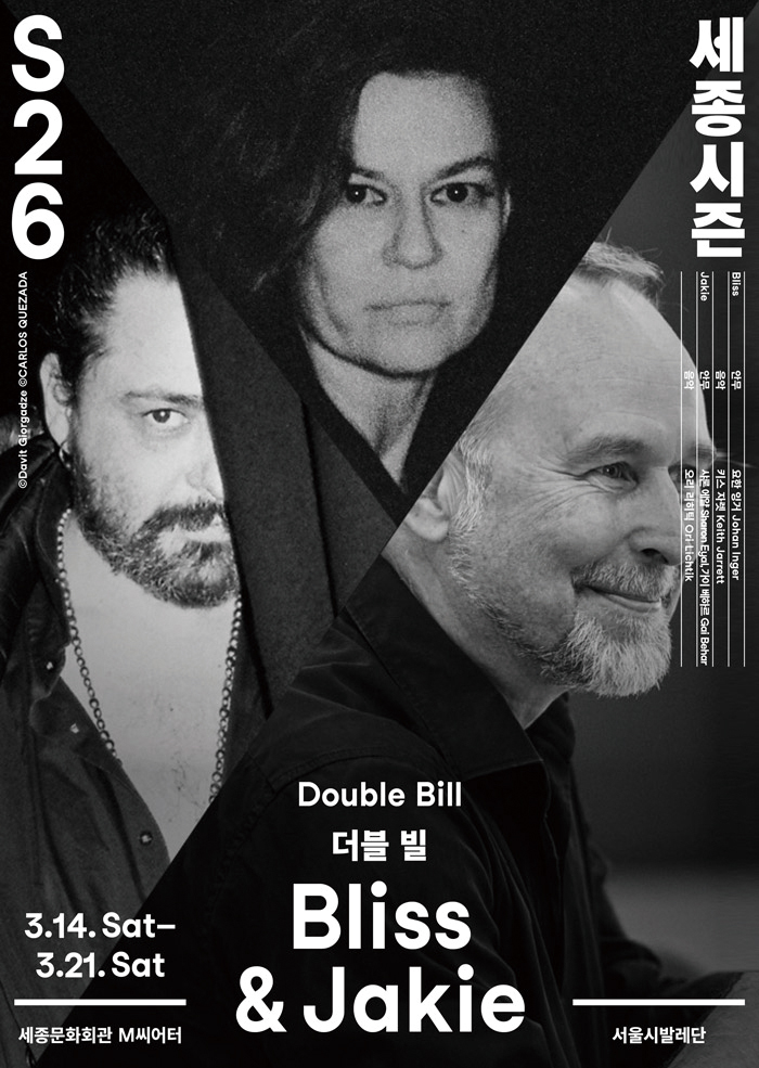 <Bliss & Jakie>서울시발레단은 2026년 시즌 시작을 알리는 첫 작품으로 더블 빌(Double Bill) 공연 <Bliss & Jakie>를 선보인다. 이번 무대는 서로 다른 미학을 지닌 세계적 안무가들의 작품 두 편을 한자리에서 만날 수 있는 기회로, 현대 발레가 지닌 감각의 폭을 극명하게 보여 준다. 첫 번째 작품 요한 잉거의 <Bliss(블리스)>는 키스 자렛의 명반 <쾰른 콘서트>를 음악으로 삼아 춤 자체가 주는 순수한 기쁨을 무대 위에 펼쳐낸다. 지난해 아시아 초연으로 호평받은 작품이 다시 한번 서울 무대에 오른다. 이어지는 <Jakie(재키)>는 안무가 듀오 샤론 에얄과 가이 베하르의 작품으로, 강렬한 전자음악 리듬 속에서 극도의 긴장과 관능을 끌어올린다. 반복과 집단성을 강조한 군무, 무용수들의 날 선 움직임은 제의적 분위기를 자아내며 관객을 압도한다.