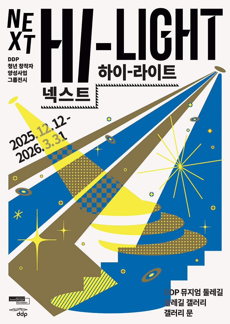 <Next Hi-Light>서울디자인재단은 신진 디자이너들의 실험적 시도를 조명하는 그룹 전시 <Next Hi-Light(넥스트 하이-라이트)>를 통해 동시대 디자인의 흐름을 소개한다. 이번 전시는 ‘힐링·컬러·기후’를 주제로 열다섯 팀의 청년 창작자가 각자의 시선으로 사회·환경적 변화를 해석한 작업을 선보인다. DDP의 공간적 특성을 살려 구성된 전시는 ‘DDP 둘레길’, ‘둘레길 갤러리’, ‘갤러리문’ 세 영역으로 나뉜다. 전통 기법을 재해석한 가구, 데이터와 바이오 소재를 활용한 미디어 설치, 관람객 참여형 작업까지 이어지며 디자인이 제시할 수 있는 새로운 가능성을 탐색한다. 전시 공간을 따라 진행되는 ‘스탬프 투어’는 관람의 재미를 더하며, 디자인을 보다 친근하게 경험할 수 있는 계기를 마련한다.