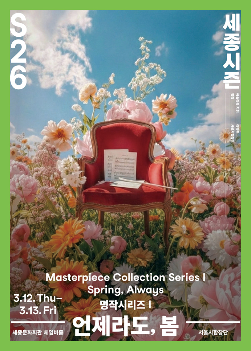 서울시합창단 <언제라도, 봄>서울시합창단은 2026년의 음악 여정을 여는 첫 무대로 명작시리즈 I <언제라도, 봄>을 선보인다. 공연은 겨울을 지나 다시 찾아온 봄의 생명력을 풍성한 합창의 울림으로 풀어낸다. 이번 무대에서는 헨델을 비롯한 시대를 대표하는 작곡가들의 합창 명곡을 엄선해 합창 음악이 지닌 본질적 아름다움과 깊이를 전한다. 클래식 합창에 익숙지 않은 관객도 친근하게 접근할 수 있도록 계절의 흐름에 맞춰 프로그램을 구성했다. 이영만 예술감독의 지휘 아래 합창 전문 연주 단체 라퓨즈 플레이어즈 그룹이 협연해 섬세하면서도 풍부한 사운드를 들려준다. 뛰어난 음향 시설을 갖춘 세종문화회관 체임버홀에서 펼쳐지는 이번 공연은 분주한 일상에서 잠시 벗어나 음악의 온기를 느낄 수 있는 시간을 선사할 것이다.