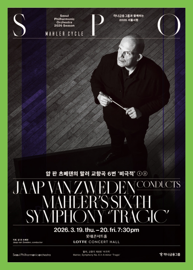 <말러 교향곡 6번 ‘비극적’>서울시립교향악단은 3월 정기 공연으로 구스타프 말러의 교향곡 제6번 ‘비극적’을 무대에 올린다. 이번 공연은 지난해부터 이어져 온 서울시향의 ‘말러 사이클’의 중요한 장면으로, 얍 판 츠베덴 음악감독이 직접 지휘를 맡는다. 말러 교향곡 제6번은 필연적 파국을 향해 나아가는 인간의 운명을 그린 작품으로, 웅장함과 비장함이 약 80분에 걸쳐 치밀하게 전개된다. 반복적으로 등장하는 ‘운명의 타격’은 청중에게 강렬한 인상을 남기며, 말러의 음악 세계 정점을 보여 준다. 얍 판 츠베덴 특유의 정교하고 힘 있는 해석은 작품 속 복잡한 감정의 층위를 선명하게 드러낼 것으로 기대된다. 웅장한 음향과 치밀한 구조가 맞물린 이번 무대는 서울시향의 깊어진 연주 역량을 확인할 수 있는 시간이 될 것이다.