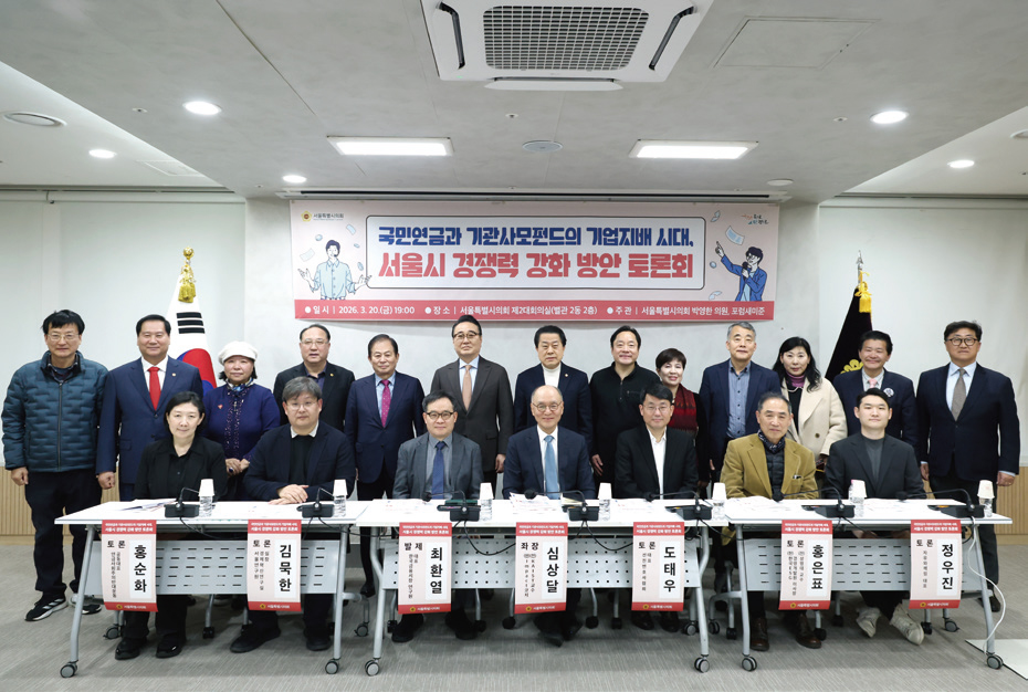 박영한 의원(중구1·국민의힘)은 3월 20일 ‘국민연금과 기관사모펀드의 기업지배 시대, 서울시 경쟁력 강화 방안 토론회’를 열어 기업경영 구조 변화와 서울시의 전략을 점검했다. 박 의원은 “서울시가 글로벌 금융 중심지로 도약하기 위해서는 시장 변화에 선제적으로 대응해야 한다”고 밝혔다. 토론에서는 ▲국민연금의 의결권 행사 확대에 따른 시장 영향 ▲기관 사모펀드의 경영 참여 증가와 기업경영 변화 ▲투자자 중심 구조 전환이 국내 산업에 미치는 파장 ▲서울시의 정책적 대응 필요성 등이 쟁점으로 다뤄졌다. 참석자들은 기업지배구조 변화가 자본시장뿐 아니라 산업 경쟁력과 직결되는 문제라는 데 공감했다. 박 의원은 “변화하는 금융 환경 속에서 서울시의 경쟁력을 재점검하는 매우 뜻깊고 의미 있는 자리였다”고 소감을 전했다.