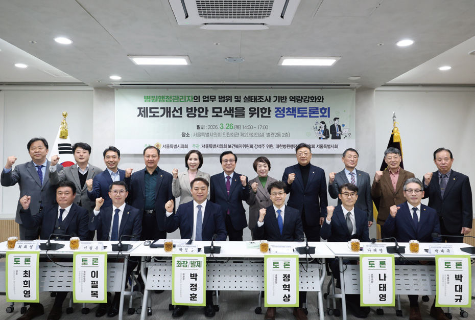 강석주 의원(강서2·국민의힘)은 3월 26일 병원행정관리자 제도 개선을 위한 정책 토론회를 열고 AI 도입 등 급변하는 의료 환경 속에서 병원행정관리자의 역할을 모색했다. 강 의원은 “병원행정관리자는 의료진이 진료에 집중할 수 있도록 병원 운영 전반을 설계하는 핵심 인력”이라며 “현장에서는 그 중요성에 비해 법적 지위와 업무 범위가 명확하지 않아 구조적 한계가 지속되고 있다”고 지적했다. 토론에서 박정훈 대림대학교 보건의료행정과 학과장은 ▲병원행정사 국가 면허화 ▲인력 배치 기준 마련 ▲경력 체계 정비 ▲정기 실태조사 체계 구축 등을 제안했다. 박대규 대한병원행정관리자협회 서울시회 학술이사는 “병원 행정 인력이 높은 이직률과 과중한 업무에 시달리고 있다”며 “법적 지위를 확립하고 인력 기준을 마련해야 한다”고 전했다.